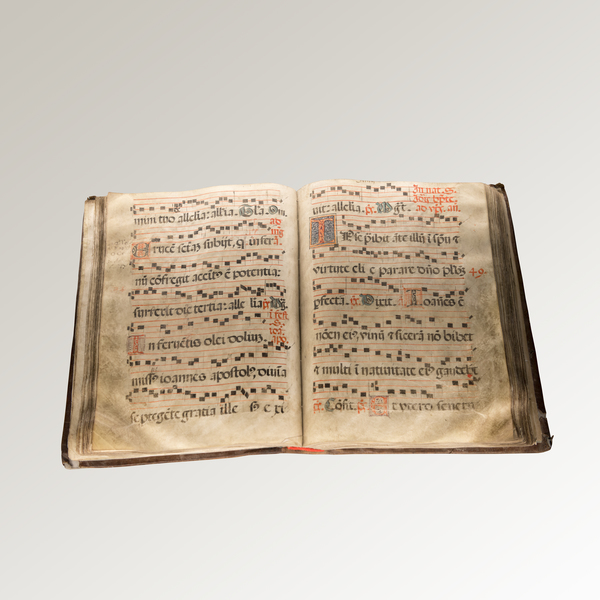 Dieses liturgische Buch enthält eigene Gebete und Antiphonen für den Eigengebrauch während der Heiligenfeste, ist auf Pergament geschrieben und besteht aus 180 Seiten. Es stammt wahrscheinlich aus dem XV. Jahrhundert (siehe Di Lorenzo 2014). Wie beim vorigen Band bezieht sich auch in diesem Fall die Datierung auf den voluminöseren und zentralen Kern des Buches. Andere Teile sind mit der Zeit hinzugefügt worden. Die Bindung des Bandes kam chronologisch gesehen nach der Zusammenstellung des Kodex hinzu. Es besteht aus rotbraunem Leder und hat einen Doppelfadenrahmen mit trockengeprägten arabesquen Mustern. Auf dem Spiegel der beiden Platten aus Pappe ist ein leeres Bischofswappen. Die vor kurzem eingesetzten Vorsatzpapiere sind das Ergebnis der Restaurierung. Die zeitgenössische Nummerierung, die auf der rechten Seite des Blattes abgebildet ist, ist in roter Tinte geschrieben und ist, bis auf kleine Lücken, folgerichtig von 2 bis 153. Die ersten zwanzig und die letzten zwölf Seiten sind nicht nummeriert. Die Pergamentblätter sind in einem guten Zustand. Sie wurden oben beschnitten, um das Einband zu machen. Es scheint nicht zeitgleich mit der Zusammenstellung des Kodex zu sein. Nur an einigen Stellen an den unteren Ecken ist eine Verstärkung aus schwerem Papier sichtbar. Auf einigen Blättern ist oben der zeitgenössische Vermerk auf die religiösen Feste in schwarzer Tinte abgebildet. Im Inneren ist die quadratische Notation in schwarzer Tinte auf rotem Tetragramm, die Notation, die den C- und F- Schlüssel verwendet und sieben Notensysteme pro Seite mit einem Custos. Die Anzahl der Tetragramme pro Seite ist jedoch nicht konstant: auf den meisten Seiten sind 7 Zeilen pro Seite, auf anderen sogar 8 oder 9. Die benutzte Schrift des liturgischen Buches ist eine gotische Buchschrift aus schwarzer Tinte. Sie ist breiter und runder im Vergleich zur gotischen Buchschrift jenseits der Alpen (Petrucci 1992, S. 131-136). Das Inzipit "Christus natus est nobis" und das Explicit "Alleluia Magnificat" wurden mit schwarzer Tinte geschrieben. Dank einer etwas detaillierteren Analyse der Schrift, der Tonalität der Tinte, der Großbuchstaben und der dekorierten Initialen, kann man die einzelnen Teile identifizieren, aus denen das Band besteht. In den ersten 23 Seiten ist es möglich einen Teil eines Kodex aus dem XV. Jahrhunderts zu erkennen mit später hinzugefügten Blättern, um den Kodex zu vervollständigen. Mit wahrscheinlich der gleichen Datierung folgt der große Korpus eines zweiten Kodex mit den Versen und Antiphonen der Feste der Heiligen. Auf den letzten Seiten befinden sich allgemeine Antiphonen des Vesperamtes und Lobpreisungen. Sie sind nicht nummeriert und sind ein offensichtlicher Zusatz. Das Band hat keinerlei Eintragungen oder Datierung. Betrachtet man die Großbuchstaben und die verzierten Initialen, die in den beiden Hauptteilen des Bandes zu finden sind, so kann man bei den Großbuchstaben Verzierungen mit Pflanzenmotiven in verschiedenen Farben bemerken: grün, orange, purpurrot, blau. Einige Großbuchstaben haben ein grünes und ockerfarbenes Muster zwischen den Umrandungen. Die Initialen hingegen wurden mit geometrischen Mustern in rot-schwarz und blau verziert. Nur ein einzelner Buchstabe zeigt die Miniatur einer menschlichen Figur in roter Tinte. Diese Figur kann man auf der Seite Nummer 5 der alten Blätterung im inneren des Buchstaben "O"s in schwarzer Tinte sehen. Die Figur stellt den Heiligen Andreas dar, der vor dem Kreuz kniet.